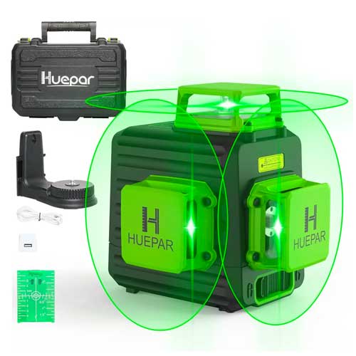 The Huepar 3D Cross Line Self-leveling Laser comes with everything you need to get started, including a Li-ion battery with a Type-C charging port, a magnetic bracket, a Type-C power cord, a power adapter, a target plate, and a user manual. It is also packaged in a hard carry case for convenient storage and transport. Overall, the Huepar 3D Cross Line Self-leveling Laser is a reliable and versatile tool that is perfect for a wide range of job site applications.