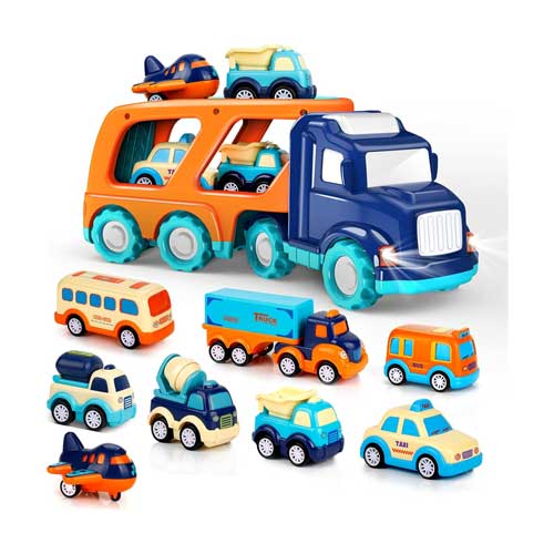This colorful transport truck set includes nine pull-back vehicles—a dump truck, school bus, airplane, and more! Designed for small hands, these sturdy cars encourage hand-eye coordination and creative storytelling. No batteries required—just pull back and watch them zoom!