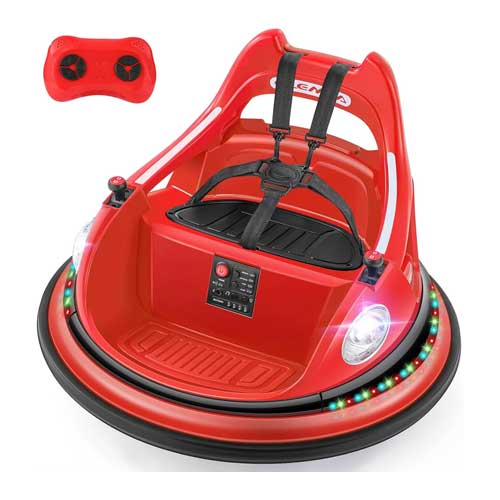 This exciting bumper car spins 360 degrees and reaches speeds of 1.9 mph. With LED lights, music, and a remote control, kids can bump and spin their way to endless fun.