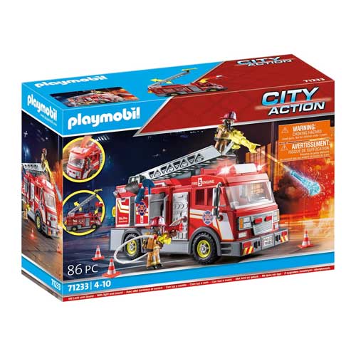 This detailed fire truck lets kids race to the rescue! The 360-degree rotating ladder, swiveling water cannon, and firefighter figures bring the action to life. Use the storage compartments to keep mission gear ready, including a fire hose, radio, and megaphone.